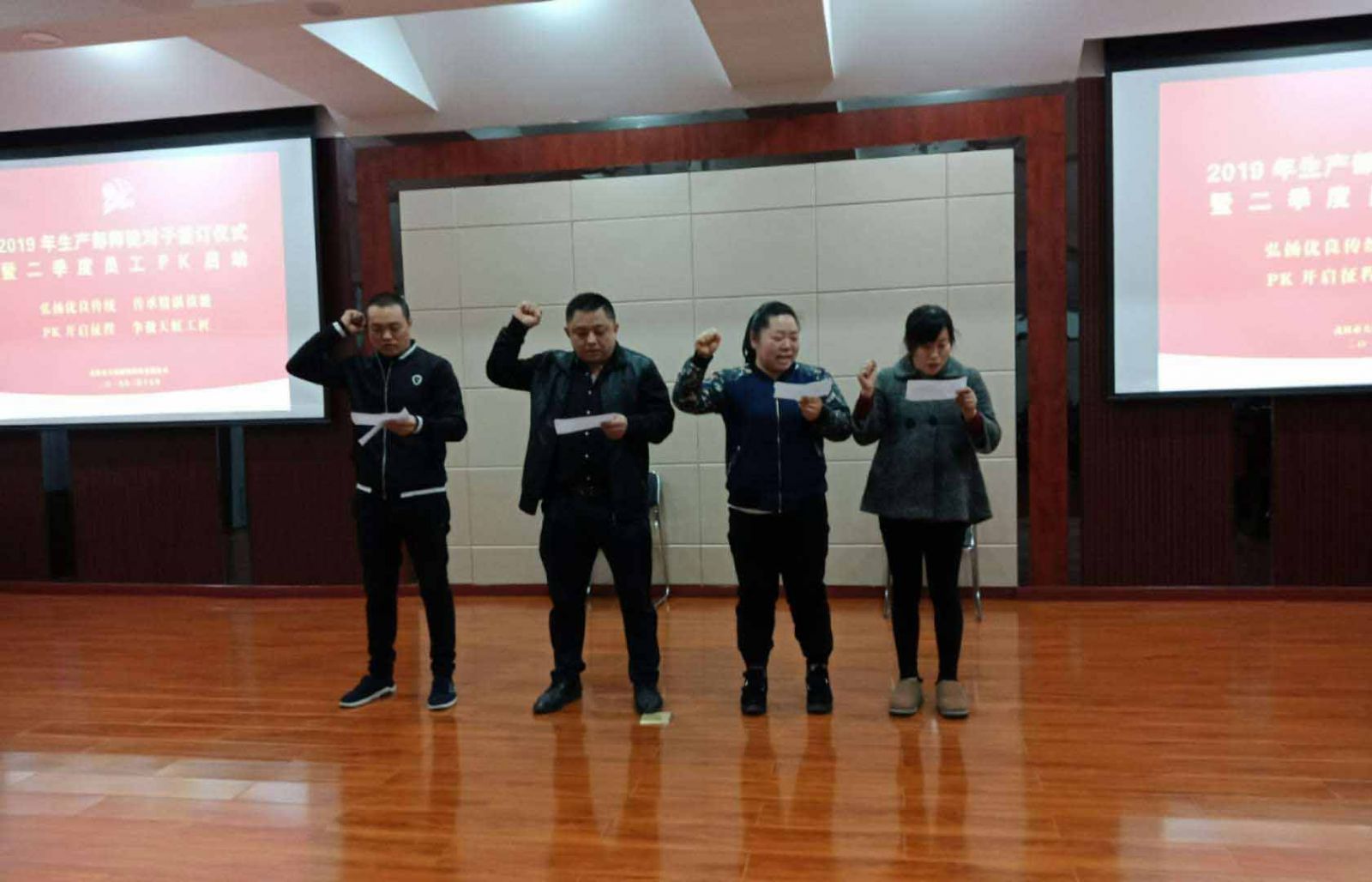 在活動現(xiàn)場,在公司總經(jīng)理陳志浩先生、營運副總馬少華先生、營銷副總高銀旺先生以及幾十名車間員工的見證下,共有10對師徒完成了拜師儀式和簽訂師徒對子協(xié)議,最后師徒們結(jié)對走上舞臺,作出莊嚴的承諾。
